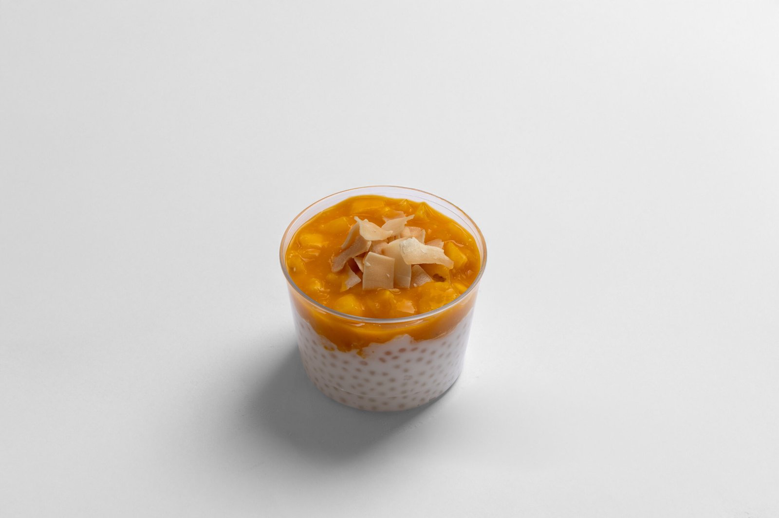 פניני טפיוקה עם קרם קוקוס, פירות טריים (מנגו/אננס/פסיפלורה) – קינוח טבעוני.
