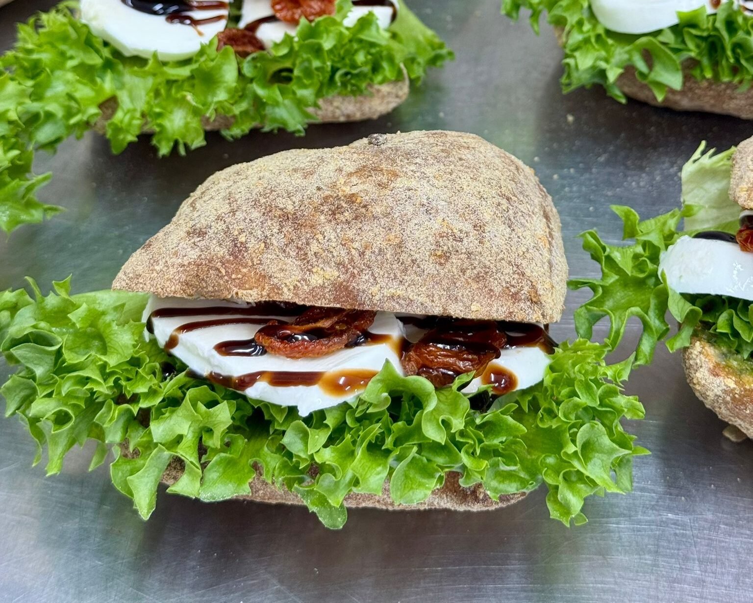 מוצרלה פרסקה, פסטו, עגבניות מיובשות , בלסמי , חסה